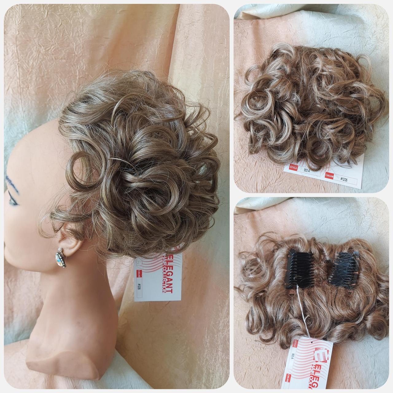Шиньйон-накладка на гребінцях подовжена (~20 см. довжина волосся). Основа 12х15 см. Зроблений об'ємними локонами по всій довжкні. Має вигляд задньої частини перуки. Фото на манікені зроблені з реального товару.