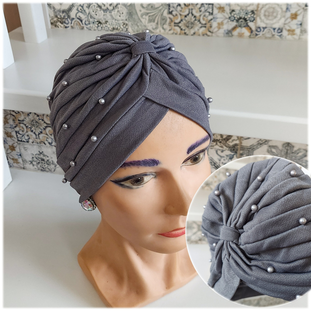 Гарна шапка трикотажна, легка (весна,літо, осінь) , об'ємнє драпірування в рубчик з складками спереду, оздоблена перлинами, у вигляді чалми або хіджабу.